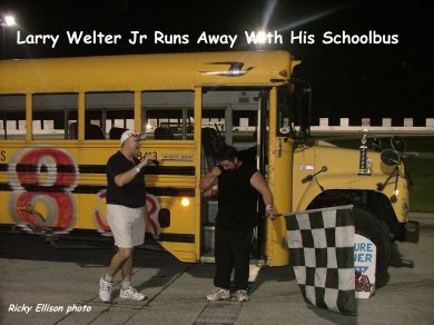 The big contact of the race goes to Larry Welter Sr. and David Foster. They suffered an extremely violent crash in the X that sent both busses way off course, and as he tried to get back on track the steering box for Foster’s bus broke, leaving him with no means to steer. The crash ended Foster’s night while he was running in second place and was the closest challenger to Larry Welter Jr. The wreck also sent the 85 of Larry Welter Sr. off course but he recovered to claim the third place trophy. Eric Gellman was the second place finisher and the first bus on the second lap after being the last bus lapped by Larry Welter Jr.
